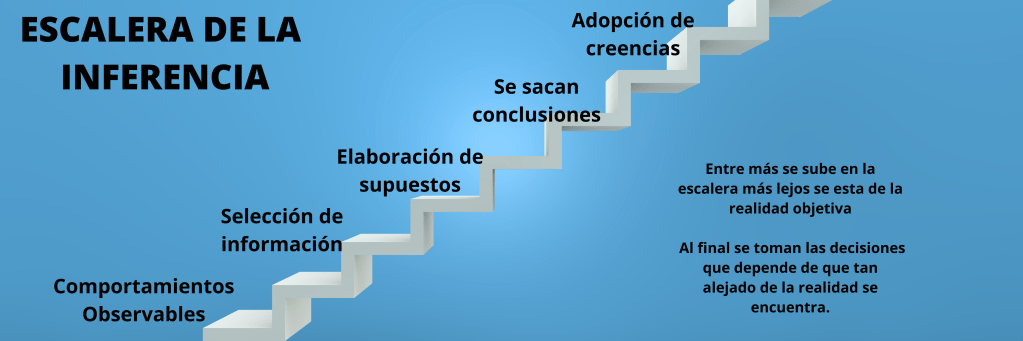 Es muy fácil subirnos en la escalera de la inferencia, de hecho constantemente lo hacemos inconscientemente y esto consiste en lo siguiente: la realidad se desprende de un comportamiento observable como: Un colaborador que no comparte trabajo con el equipo, enseguida tendemos a asumir el motivo del comportamiento “Tiene un ego muy alto”, y seguimos asumiendo, esta vez las emociones “De de sentirse superior” y así seguimos haciendo inferencias y cada vez nos alejamos más de la realidad.