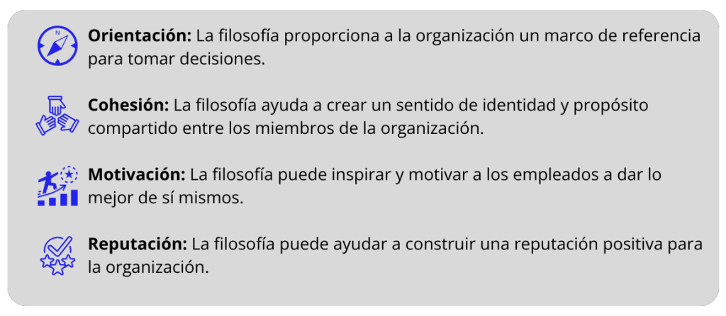 La filosofía es un elemento esencial para cualquier organización que quiera ser exitosa. Al contar con una filosofía sólida, la organización podrá orientarse, cohesionarse, motivarse y construir una buena reputación.