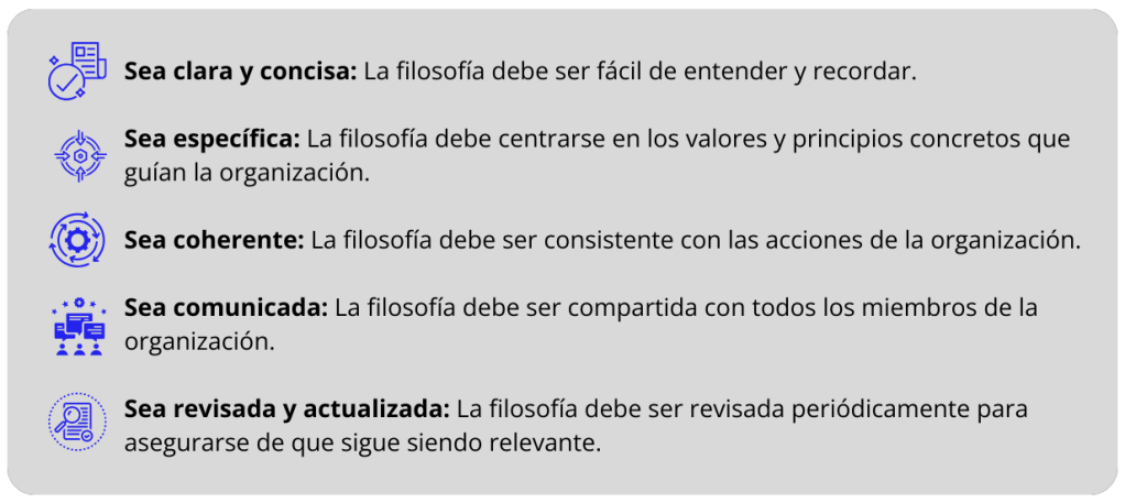 La filosofía de una organización es su conjunto de valores, creencias y principios que guían su comportamiento. Es lo que la hace única y la distingue de las demás.
